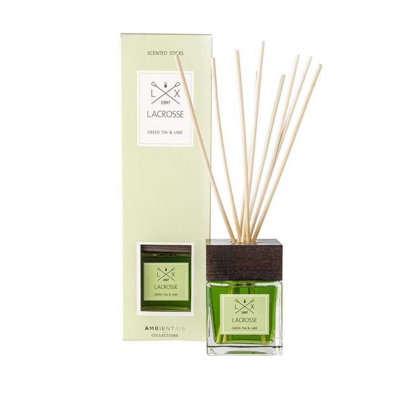 Difusor de Aromas en formato Mikado de la marca Lacrosse, de 100 ml, en el exclusivo aroma de Te Verde y Lima. Diseño inspirado en los tonos de la naturaleza. Este ambientador de varillas representa la unión perfecta entre modernidad y clasicismo. Descubre las excepcionales fragancias que Lacrosse ha creado para tu hogar.