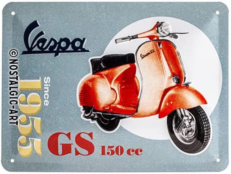 Placa Metálica de Alta Calidad de 15x20 cms cms fabricada en chapa de acero e impresa en relieve en múltiples capas. Se presenta en sobre de envoltorio individual. de diseño Vespa GS 150 Since 1955 Vespa es una marca símbolo de Italia. Muy querida en ese país, es también un referente mundial de los años 60. Descubre toda la colección de Carteles y Placas Metálicas de Retro y Vintage de la marca Nostalgic Art. Esta marca es el referente para los amantes del coleccionismo de Imanes, Letreros y Carteles Metálicos, Cajas Metálicas, con diseños originales estilo Retro Vintage y Años 60. Placas de marcas de coche y moto como Fiat, BMW, Vespa.... O de marcas como Coca-Cola, Kellogs... ¡Descubre toda la colección! Uno de los regalos más originales y sorprendentes que puedas encontrar.