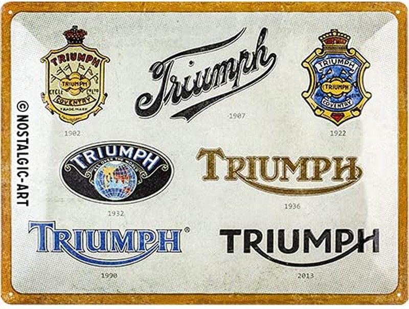 Placa Metálica de Alta Calidad de 30x40 cms cms fabricada en chapa de acero e impresa en relieve en múltiples capas. Se presenta en sobre de envoltorio individual. de diseño Triumph Logo Evolution Esta colección de postales, carteles y letreros de Decoración, son ideales para decorar Cafeterías, Restaurantes, Hoteles, Bares y Casas Rurales. Descubre toda la colección de Carteles y Placas Metálicas de Retro y Vintage de la marca Nostalgic Art. Esta marca es el referente para los amantes del coleccionismo de Imanes, Letreros y Carteles Metálicos, Cajas Metálicas, con diseños originales estilo Retro Vintage y Años 60. Placas de marcas de coche y moto como Fiat, BMW, Vespa.... O de marcas como Coca-Cola, Kellogs... ¡Descubre toda la colección! Uno de los regalos más originales y sorprendentes que puedas encontrar.