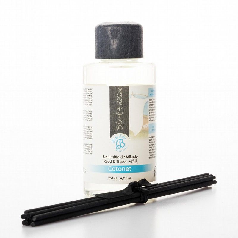 Recambio de Mikado o Difusor de Aromas de la marca Boles d'Olor Black Edition. Formato de 200 ml que incluye Varas de Rattan. Con los aromas para Mikado de Boles d'Olor ambientarás tu hogar de un modo respetuoso para el medio ambiente y para tí. Sin alcohol ni otros compuestos orgánicos volátiles. Las nuevas varillas de fibra de algodón, con una alta capacidad de absorción capilar, extienden poco a poco el aroma que te roderá y completará tu hogar. Un gran complemento, muy efectivo y duradero, ideal para decorar y perfumar tu hogar. Cotonet huele a limpio y fresco, como la sensación de oler la ropa recién sacada de la lavadora. Es acariciar el algodón mullido por el suavizante.